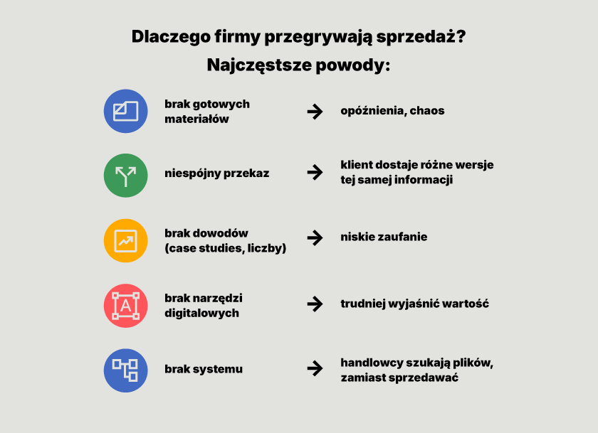 - Braku kontroli nad przekazem i chaosu organizacyjnego, bo handlowcy tworzą prezentacje i oferty na własną rękę.